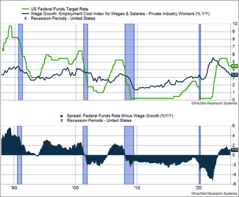 Make no mistake, the status quo of the Fed staying on pause means policy is actually getting tighter and pushing a further slowdown in the economy. The Employment Cost Index for the first quarter (Q1) showed private sector wages and salaries are up 3.4% from last year, well below the Fed’s policy rate of 4.25-4.5%. Wage growth has been on a downtrend over the past year, and if the Fed pauses here that means policy is getting tighter.  Historically, the fed funds rate (the short-term policy rate the Fed sets) rising well above the pace of wages has constricted the economy and ultimately these situations ended up in recessions.
