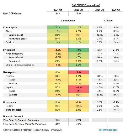 • GDP fell 0.3% annualized in the first quarter but the impact of tariffs is making the reading very noisy and the underlying data says we’re not in a recession.