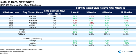 The chart below lists previous major S&P 500 milestones and the returns that followed. The good news is the S&P 500 was higher six months later every time and up a solid 8.0% on average, versus the average six-month return of 4.4%.
