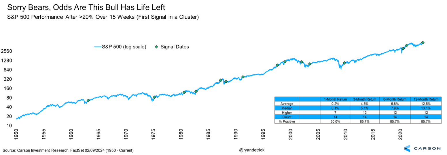 We found 14 other times the S&P 500 gained 20% or more in 15 weeks. One year later the index had added another 12.5% on average and was higher 85.7% of the time.