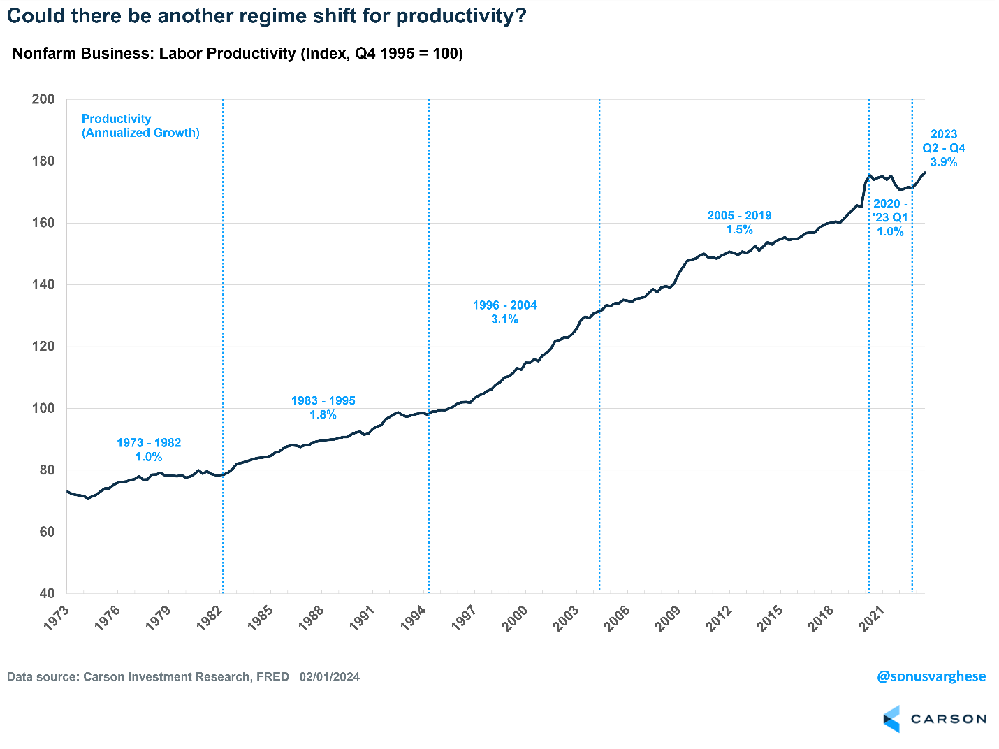Productivity growth surged at an annual rate of 3.9% over the last three quarters of 2023, which is the largest non-recessionary gain since the late 1990s and more than double the pace of productivity growth between 2005 and 2019.
