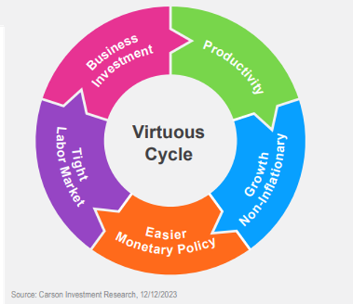 As we wrote in our 2024 Outlook, “Seeing Eye to Eye” (download here), productivity growth is a game-changer for the economy. Higher productivity means workers can have strong income gains without putting upward pressure on inflation. This in turn allows the Federal Reserve to back off from running interest rates at a very high level. Easier rates and the promise of higher demand, thanks to stronger incomes, can spur business investment — into labor, technological equipment, and structures — all of which can further boost productivity. That’s the virtuous productivity cycle, pictured below, which we last experienced in the late 1990s.