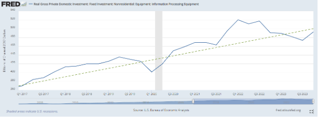 Generative artificial intelligence (AI) and its prospects to boost productivity have drawn a lot of attention. The reality is we haven’t seen the impact of AI yet on a broad economic level. After adjusting for inflation, investment in information processing equipment is running below the 2017-2019 trend. It did pick up in the fourth quarter, but clearly we have some ways to go.