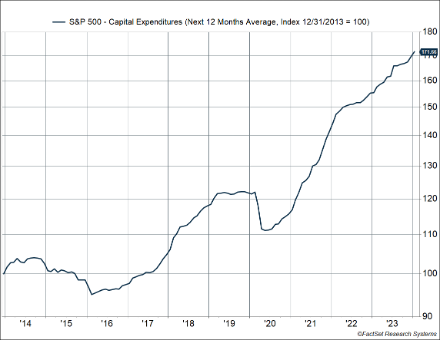 Encouragingly, the latest earnings season shows forward expectations of capital expenditures (capex) for companies in the S&P 500 continuing to push higher. Over the six years from 2014 to 2019, forward capex rose 22%. Since the end of 2021, through January 2024 (two years and one month), forward capex has grown 21%.