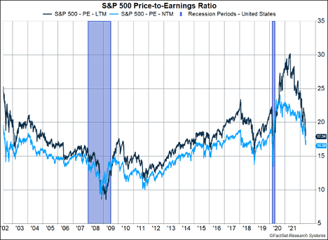 When markets fall, many believe bad outcomes become more probable. Our view is the width of the path to success widens when markets go down because valuations are falling. As Figure 2 shows, the price investors pay for a dollar of earnings has declined to around the average level from 2015-2019. Compared to the heightened valuations caused by earnings declines from the pandemic, current valuations are lower. Lower valuations mean less optimism about how companies will fare in the future. When valuations drop, it means expectations are dropping as well, and that means pretty good numbers can become “good enough” and stocks can increase.