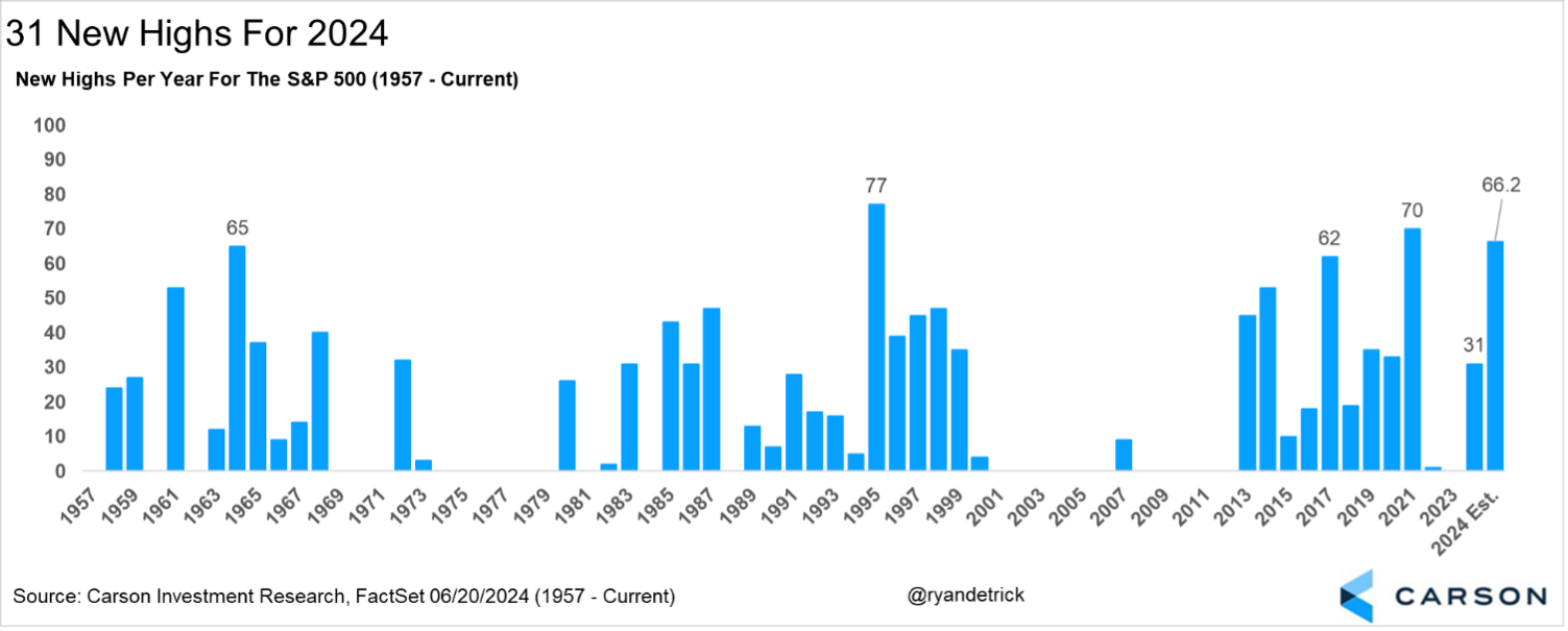- More than 30 new all-time highs in a year has seen an average gain over the year of nearly 20%. 2024 already has 31 new all-time highs.