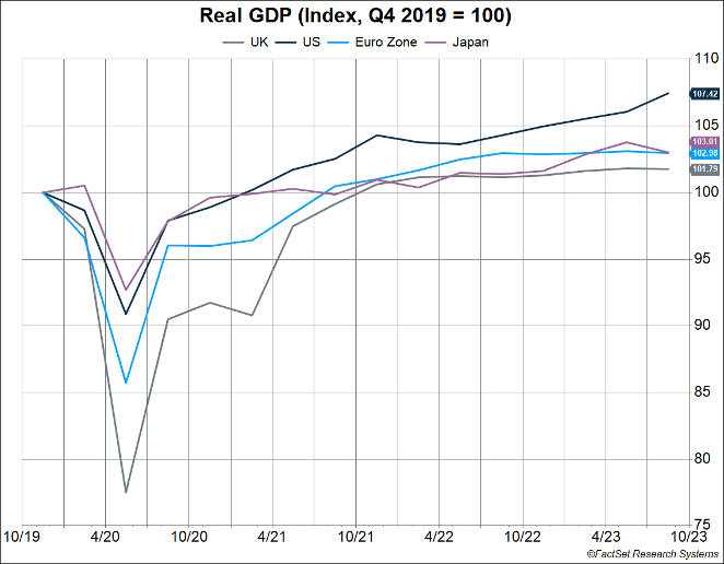 The economy appears poised to grow around 2.5-3% in 2023 after adjusting for inflation, which would be above the 2010-2019 trend. That is remarkable, especially given the massive headwind of surging interest rates. No wonder the consensus has shifted away from recession calls, although several outlooks from across the industry still suggest poor growth in 2024. The U.S. has now raced ahead of other developed markets in economic growth since the pandemic. The U.S. economy is 7% larger in real terms, versus 3% or less for its developed peers.
