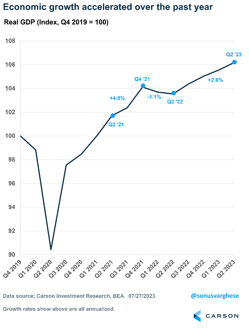 After a large reversal Thursday, stocks bounced back Friday, bolstered by the continued impressive performance of the economy (further details below). This has already been a historic year — the stock market experienced one of its best starts in 2023. The S&P 500 is up close to 20% for the first seven months, and the Nasdaq is up even more.