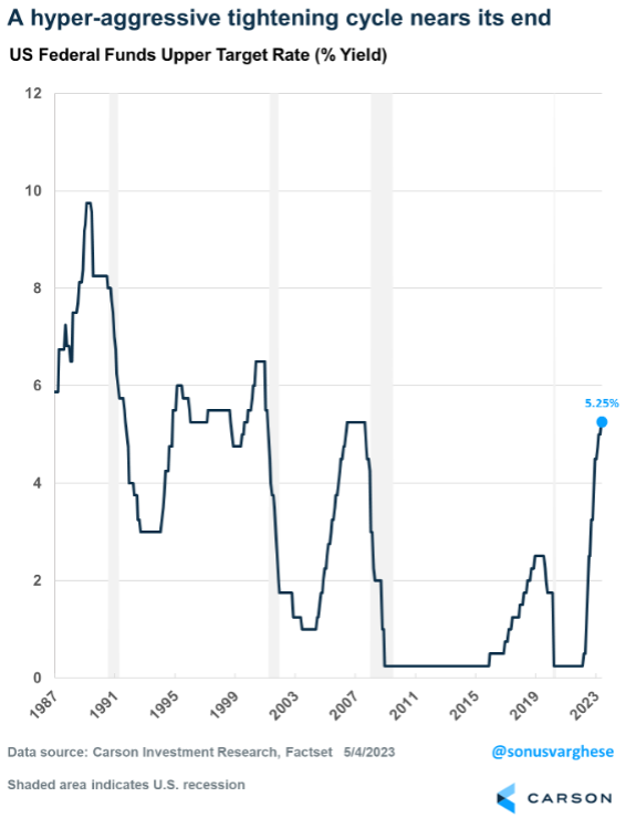 The rate hike in May was expected, but more welcome was the fact that the Fed didn’t think “additional policy firming may be appropriate.” While this was not an explicit signal that Fed officials are pausing, it indicated they will be more data dependent. Fed Chair Jerome Powell explicitly referenced this in his comments about the future direction of policy, saying it will be assessed based on incoming data, including employment and inflation. The Fed has done a lot — and officials believe the economy is yet to reflect the full impact.