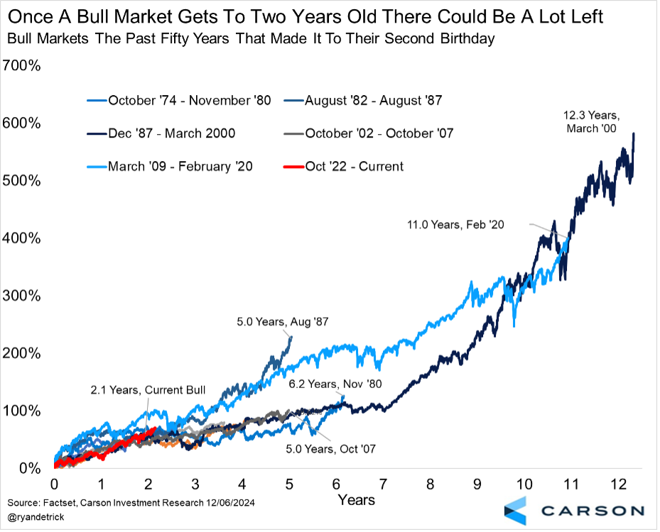 Stocks are looking at back-to-back 20% gains for the first time since the late 1990s, bringing many to worry this bull market could be about to end. Looking at the evidence, we don’t think so. This current bull market is nearly 26 months old and is now up more than 70% from the mid-October 2022 lows. But the good news for investors is that once previous bull markets got to this point there were many more years of gains left.