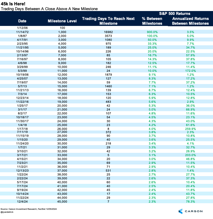 The Dow hit a record eight 1,000-point milestones this year and with a few more weeks to go, more could possibly be coming. In fact, it took only seven trading days to go from 44,000 to 45,000, the second fastest 1,000-point milestone ever.