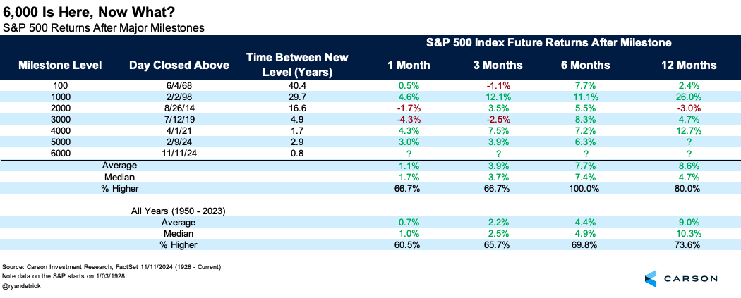 Turning to the S&P 500 and 6,000, it appears that these milestone levels can be a good sign, as stocks have never been lower six months later. We’ve discussed before that new highs tend to be bullish and these 1,000-point milestones are new highs, so strong results over the ensuing six months makes sense.