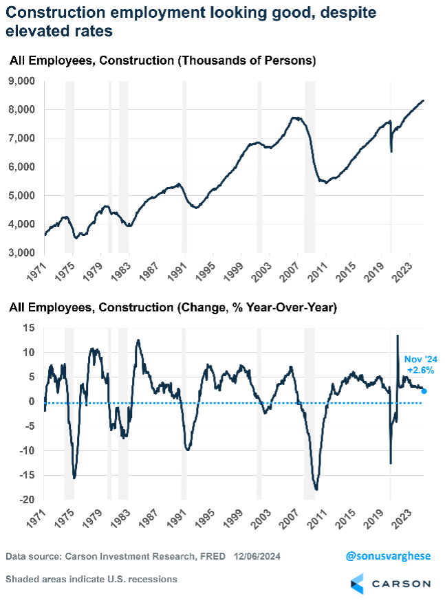 One of the more encouraging parts of the labor market, and really for the economy, is that construction employment is running solid. It was strong even in 2022 and 2023, which was another clue that a recession wasn’t imminent. Historically, construction employment has foreshadowed further weakness across the labor market (and recessions), which makes sense because elevated interest rates (and tight monetary policy) has preceded past recessions.  If housing remains weak due to elevated rates, we could see construction employment start to pull back. For now, construction employment is rising at a very healthy 2.6% year-over-year pace, spurred by building construction (residential, but also non-residential like manufacturing facilities) and even home improvements. However, this is something we’re going to be watching very carefully as 2025 progresses.