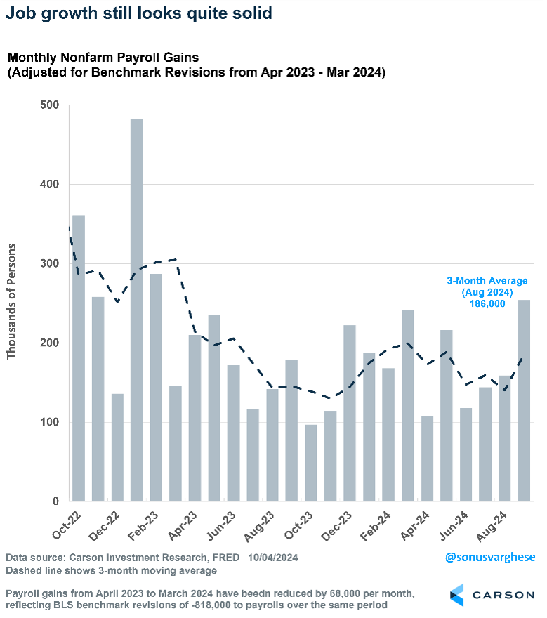 The September payroll report went a long way to ease some of these concerns (which is not to say risks have disappeared). Payrolls grew by 254,000 in September, doubling expectations for a 125,000 increase. Monthly payrolls can be noisy and subject to revisions, but July and August payrolls were revised higher, taking the 3-month average to a solid 186,000. This report also takes on outsized significance because the next two payroll reports are likely to be impacted by Hurricane Helene, with job growth pulled lower in October and reversing in November. The good news is that the port strike has ended, and so that’ll be a non-factor. In any case, it’s going to be January (when we get December payroll data) before we get another “clean” report.