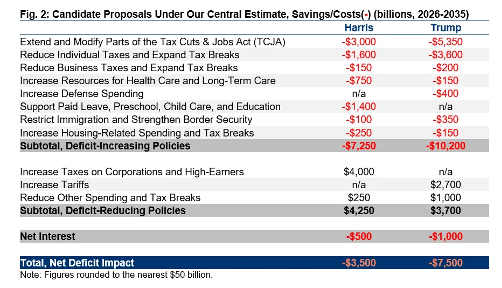 Both Harris and Trump have put out various tax proposals, and we can’t really know what will be implemented once campaign rhetoric ends and the realities of governing begin. In addition to not knowing who will be in the White House and the make-up of Congress, we don’t even really know how much of this is really just talk to win votes. But nevertheless, the big picture is that for either candidate, deficits are likely to increase.