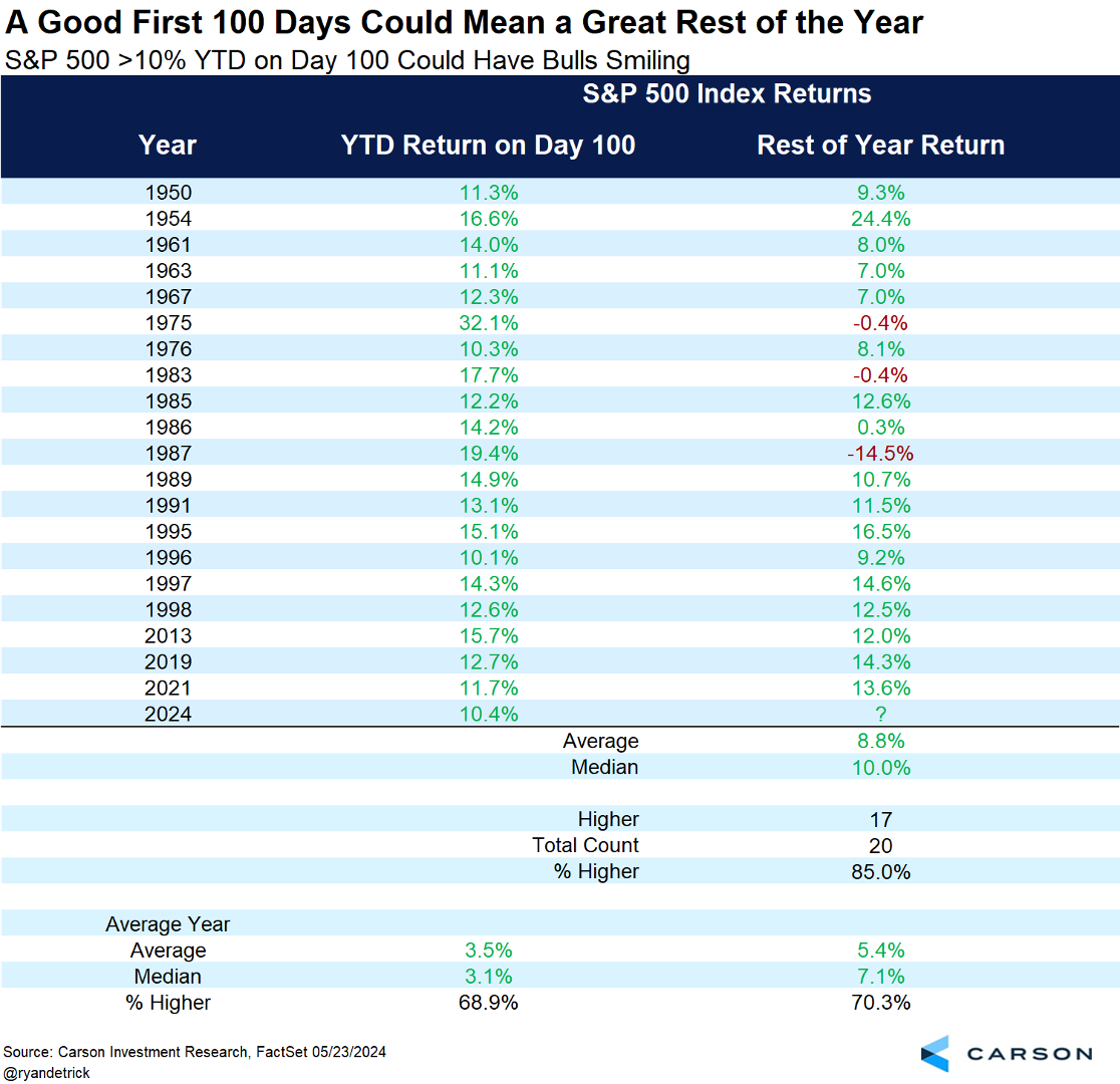 One hundred trading days into 2024 (the 100th day was last Thursday), this year is the strongest election year ever, up 10.4%, topping the previous best of 10.3% in 1976. Most election years tend to be weak early, but they do better as the year progresses. So, what does a good first 100 days tell us? We found 20 other times the S&P 500 was up double digits as of day 100, and the rest of the year was higher 85% of the time and up close to 9% on average, with the median return even better. In fact, eight of the last nine times, stocks rose by double digits the rest of the year. The bottom line is a big start tends to see the bulls in control for the remainder of the year.