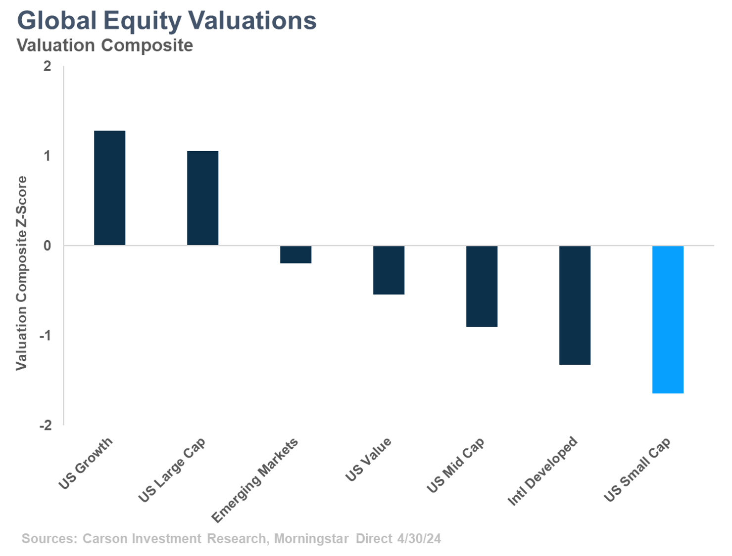 - U.S. small-caps and international stocks continue to appear inexpensive historically, although valuations aren’t a timing mechanism.