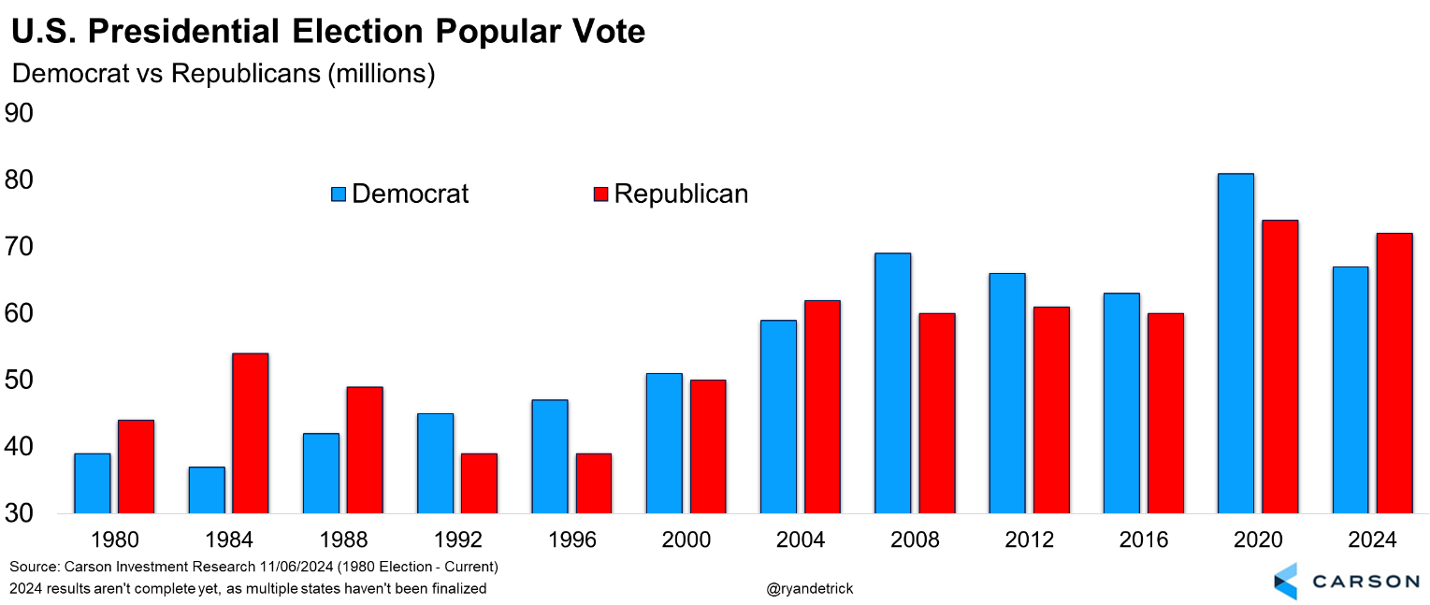 The big surprise for many, though, was Trump won the popular vote as well, the first Republican to do this since 2004. He is up to more than 72 million votes, which will go higher once Arizona and Nevada become official. Interestingly, Democratic votes dropped from a record 81 million four years ago to 67 million this go around, although complete California results should increase that a little.