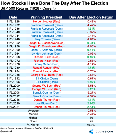 The S&P 500 soared 2.5% the day after the election, which was the best post-election day ever. Be aware though, it also jumped 2.2% when President Biden won in 2020. The last eight elections stocks moved at least 1% the day after the election, so post-election day volatility is normal.