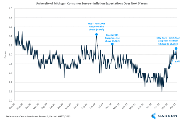 The Federal Reserve considers consumer sentiment, and especially consumer expectations for inflation, an important indicator. Fed members fear that rising inflation expectations will keep inflation higher for longer. The idea is if consumers expect more inflation, they will ask for higher wage increases, which will result in more spending and put upward pressure on prices, leading to a cycle of “spiraling inflation.” Now, inflation expectations rose over the past year, along with gas prices. But there is some good news as far as the Fed is concerned: Long-term inflation expectations (over the next five years) have fallen to 2.9%, and that is right at the three-decade average for this metric.