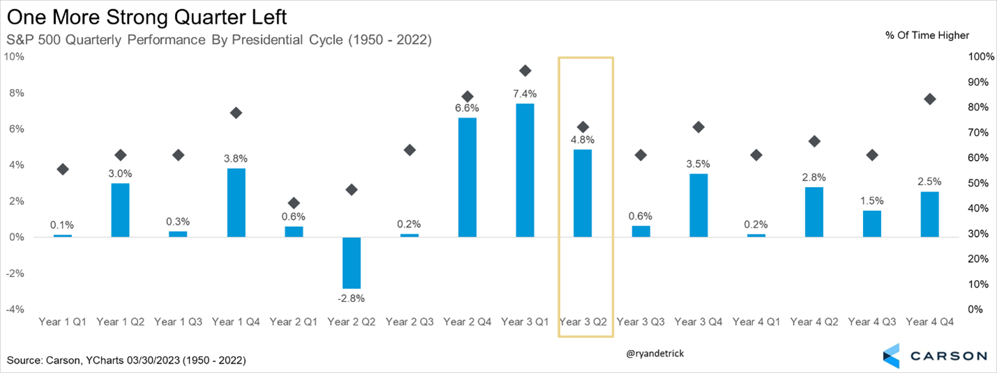 Market performance during the four-year presidential election cycle shows that this quarter is historically quite strong, as are the previous two quarters. The S&P 500 Index added 7.6% in the fourth quarter last year and another 7.5% last quarter, so the trend is playing out well so far. We would never invest blindly based on seasonality, but this could bode well for a continuation of the surprise spring rally.