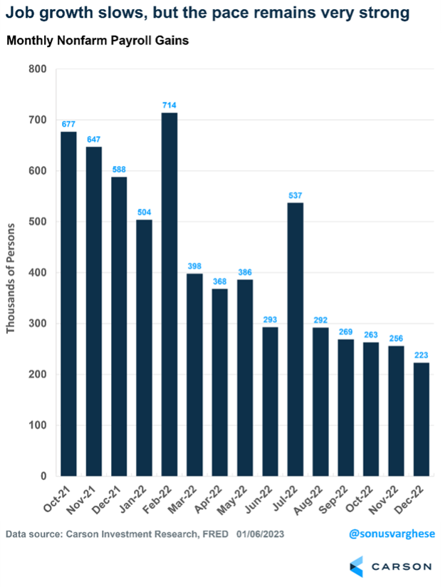 The December payroll report was yet another upside surprise. Monthly payrolls rose by 223,000, above expectations for a 200,000 gain. As Fed Chair Jerome Powell has noted, the economy needs to create about 100,000 jobs a month to keep up with population growth. That’s less than half the current pace.