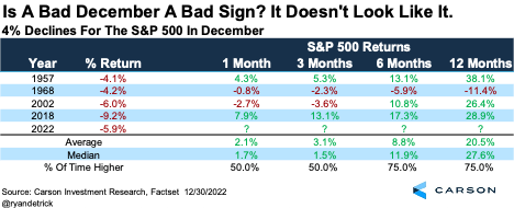 Many market watchers have said the stock market’s poor performance in December could be a warning sign. Historically, the last month of the year is quite strong for stocks. But as with much of last year, that wasn’t the case in 2022. In the end, the S&P 500 fell 5.9%, marking one of the worst Decembers ever and the worst since 2018. So, how worried should investors be?