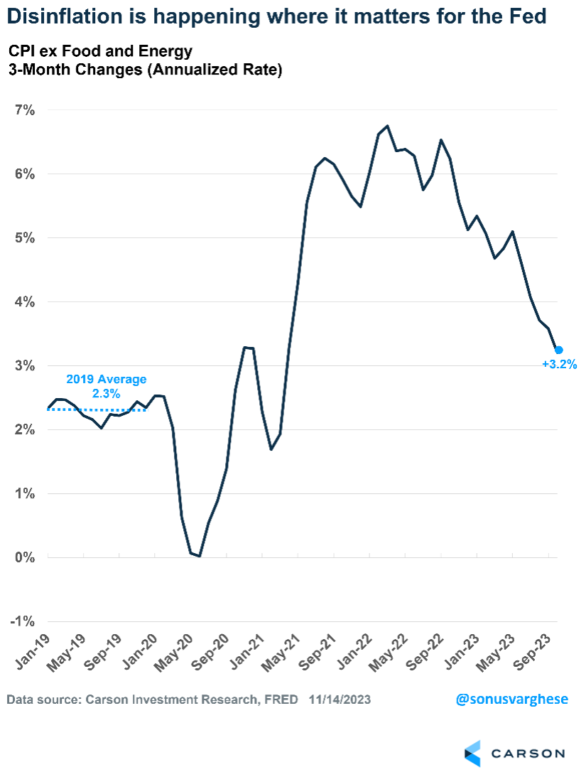 The October Consumer Price Index (CPI) report was chockful of good news. Headline inflation was flat in October, below expectations of a 0.1% increase. The October “surprise” came on the back of lower gasoline prices, which fell 5%. That is particularly meaningful because households have more income to spend elsewhere — keeping consumption and the economy humming. Headline inflation has pulled all the way back from 9% year-over-year in June 2022 to 3.2% in October. The big decline was accompanied by lower energy prices, but as the chart below shows, all the other contributors are shrinking, too.