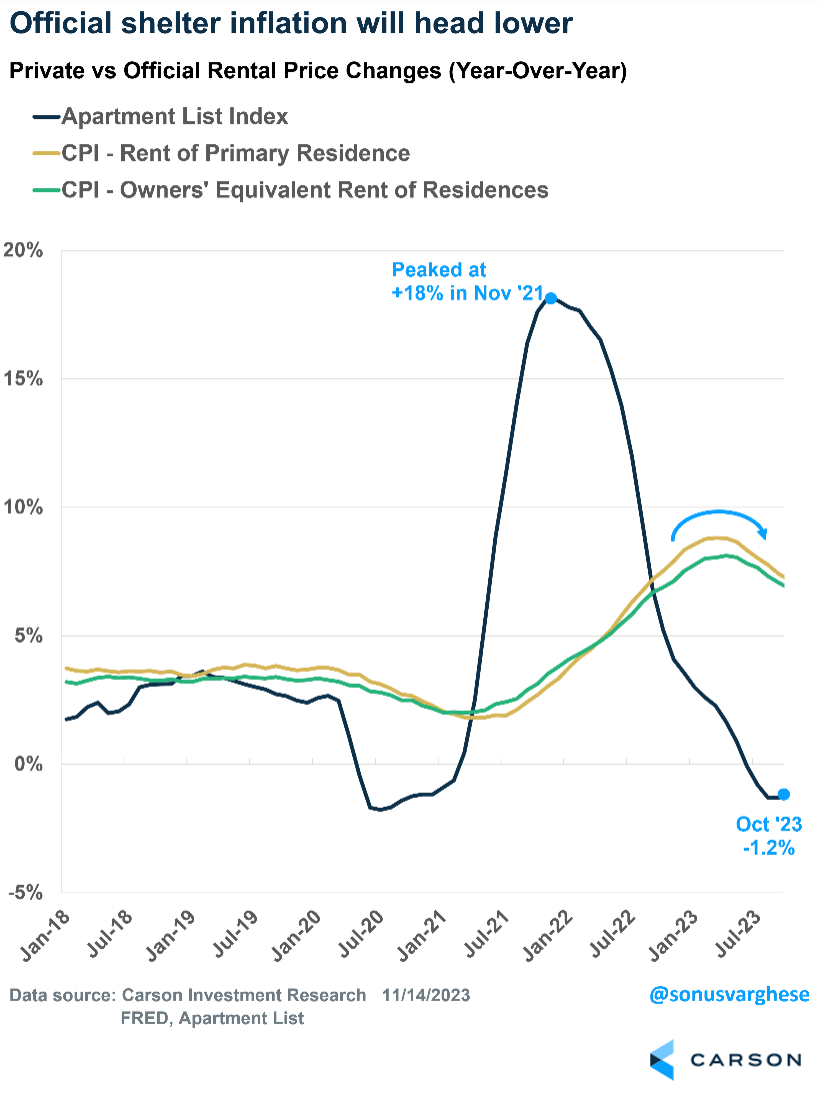 Housing disinflation has been expected for a while now, with falling market rents indicating that official data will follow. Housing prices spiked briefly in September, but the downtrend resumed in October, with housing inflation running at close to a 5% annualized pace — the slowest pace since December 2021. More disinflation is likely, as private market data indicates that rents continue to fall.