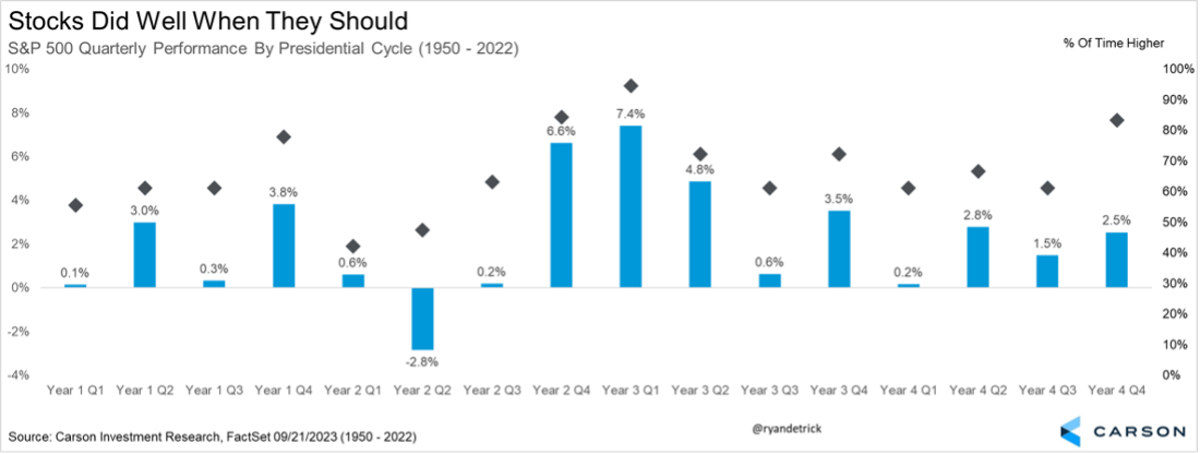• Carson’s team provides its top charts that tell the story of 2023, including the four-year presidential cycle, high-tech manufacturing, bond yields, equity style performance, and a certain chipmaker that received a lot of attention.