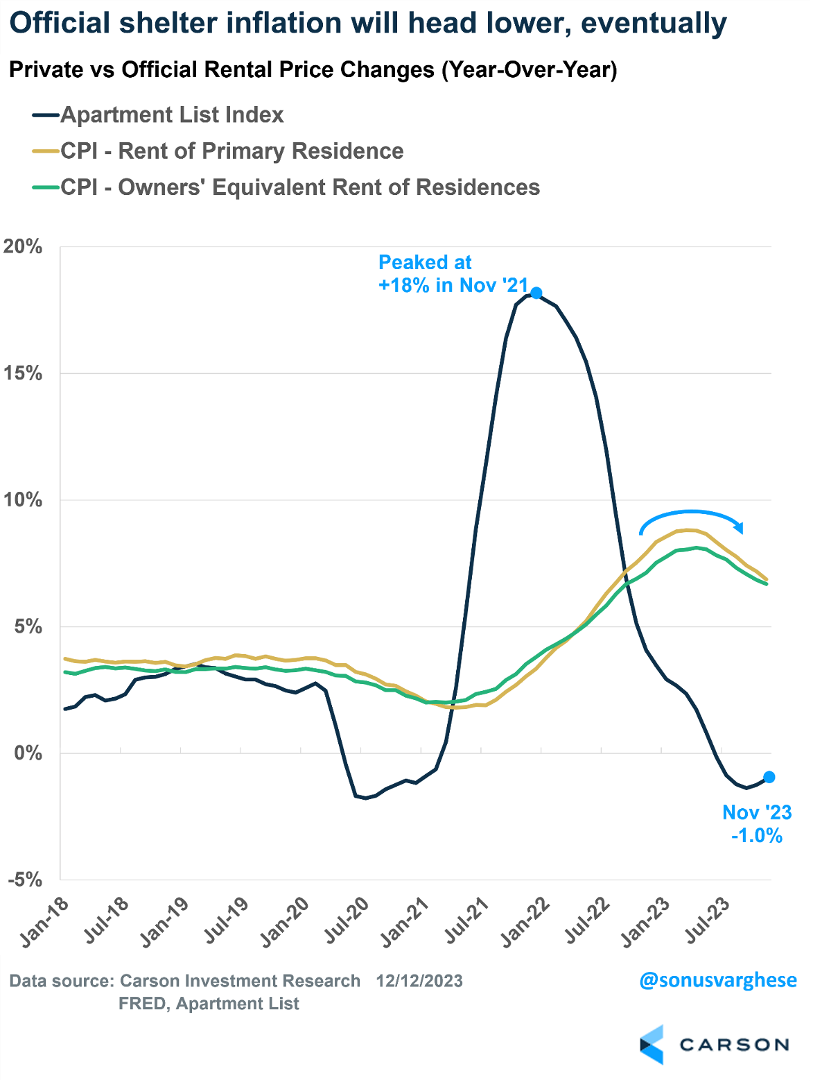 The chart includes private data from Apartment List, which show that rent prices collapsed well ahead of the government’s data. The government’s data lags by many months, and this was a subtle clue that shelter (40% of the core Consumer Price Index) was likely going to crack eventually. Sure enough, late last year shelter inflation began to slow and the Fed began to pivot at its final policy committee meeting of the year, which concluded Dec. 13.