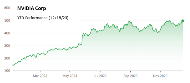 To me, the narrative of 2023 is captured by a chart showing the performance of NVIDIA, the maker of high-end computer chips that have become the bedrock of artificial intelligence (AI). Emerging from the depths of the 2022 bear market, the introduction of ChatGPT illuminated the potential of AI for the layman, igniting a remarkable surge in related tech stocks. Despite higher interest rates, mega-cap technology companies roared higher. As we approach 2024, the AI theme appears enduring. But investors are now recognizing its broader implications as this transformative technology permeates businesses of all shapes and sizes, not just mega-cap tech.