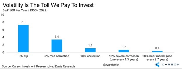 The S&P 500 pulled back nearly 8% in March during the regional banking crisis and recently fell nearly 5% from the late July peak. However, it’s important to remember that volatility is normal, even in bull markets, and it is the toll we pay to invest. Or as Jack Bogle, the founder of Vanguard, put it, “The stock market is a giant distraction to the business of investing.” In other words, stock market volatility can make you take your eyes off the prize of longer-term investing.