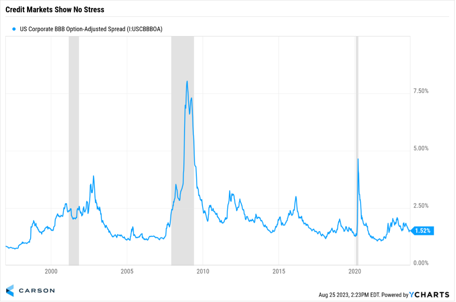 Credit spreads tell us how much extra interest over Treasury rates investors are demanding from companies that want to borrow money — if investors believe a recession is imminent, they may expect lending to companies to be more risky and hence demand higher interest rates. In other words, if there was a monster under the bed the credit markets would likely show it.
