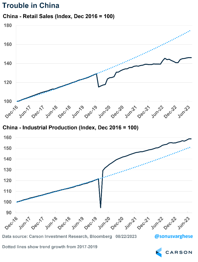 We’ve received several questions on China recently, including how the economic turmoil there may impact the U.S. and financial markets. In short, China’s economy is in trouble. Retail sales are up just 2.5% year over year, well off the pre-pandemic average pace of 7-10%. Usually, the industrial side of the economy makes up for slow consumer spending, but not this time. Industrial production is up just 3.7% since last year, which is well below the average 6% pace before the pandemic.