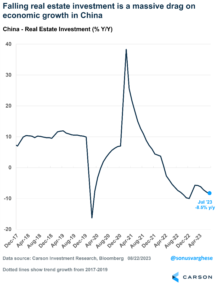• Much of China’s economic growth is driven by real estate investment, which has pulled back significantly.