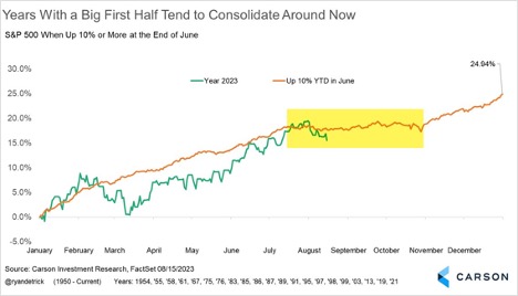 Our research also shows that when markets are up at least 10% by mid-year, seasonal weakness tends to follow. So, the pullback we’re seeing now shouldn’t be a shock. The good news is once this period has passed, the rest of the year is typically strong. This is how we see 2023 playing out, with the S&P 500 hitting new highs before the ball drops.