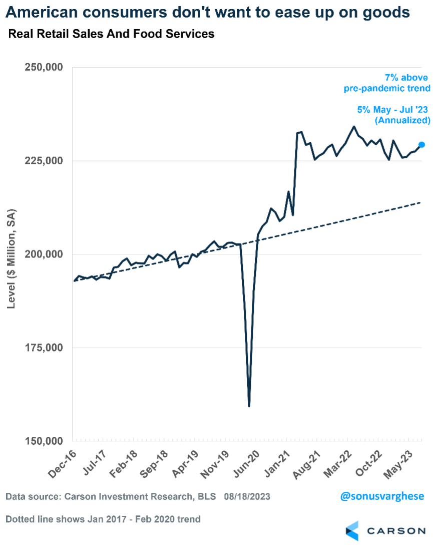 Retail sales and food services rose 0.7% in July. One month may be noisy, but even the three-month average shows retail sales rose 7% at an annualized pace. Inflation was up just 1.9% over this period, which means inflation-adjusted retail sales rose at a 5% annualized pace — 7% above the pre-pandemic trend. That’s incredible and indicates how strong households are.