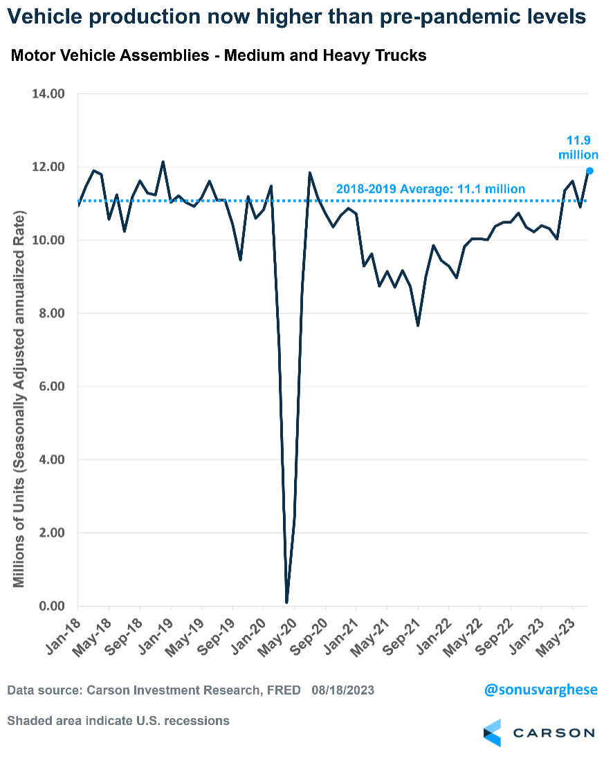 Vehicle production has rebounded to the highest level it has been since 2018, which means it’s even higher than at any point in 2019. Despite that, production has yet to make up for a cumulative shortfall of 5 million vehicles due to pandemic shutdowns, which means production is likely to remain strong.