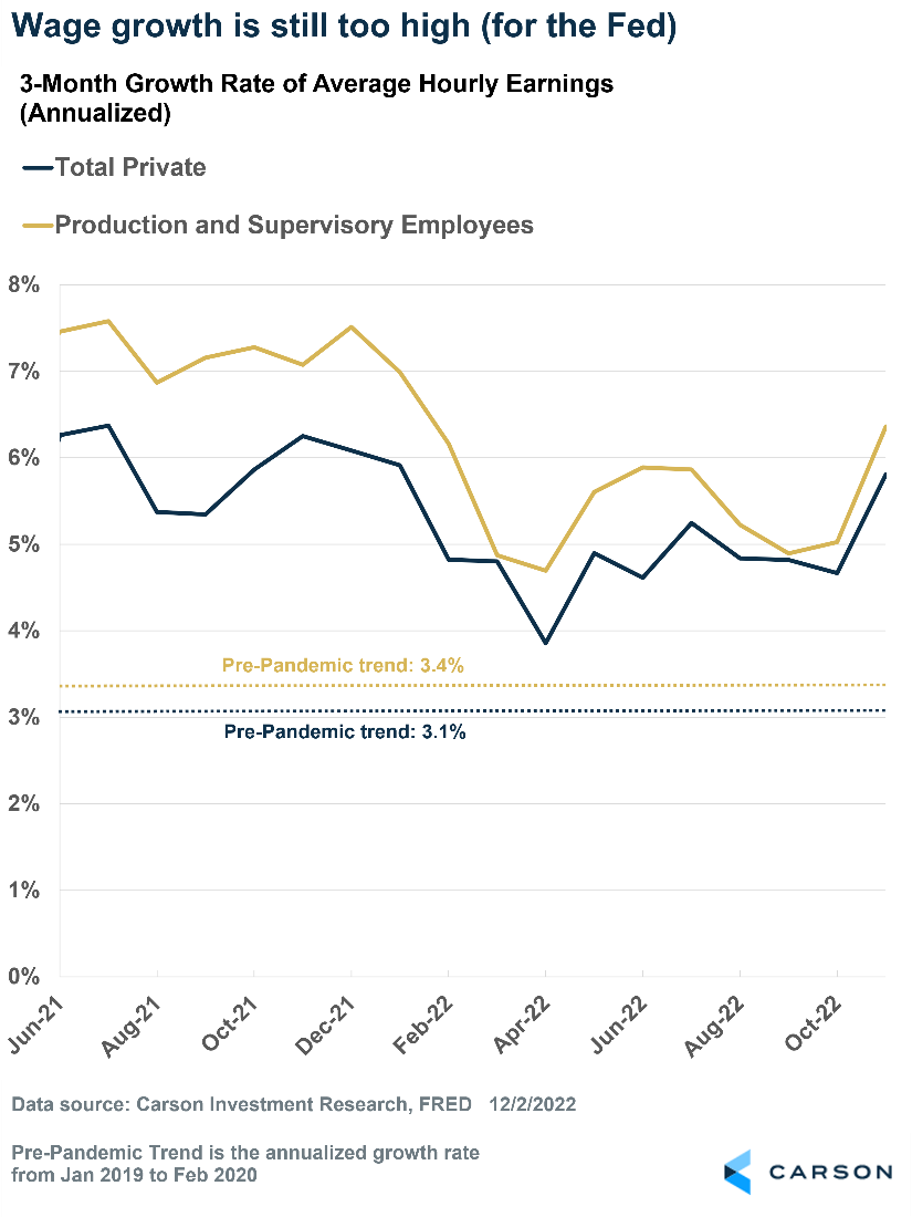 The big headline for the November payroll report was that 263,000 jobs were created last month, well above expectations of 200,000. Job growth has slowed since the beginning of the year, but make no mistake, this is still a very strong pace of job growth. As Fed Chair Jerome Powell noted in his recent comments, Fed members think monthly job gains of 100,000 are required to keep up with population growth. We’ve been well above that recently.
