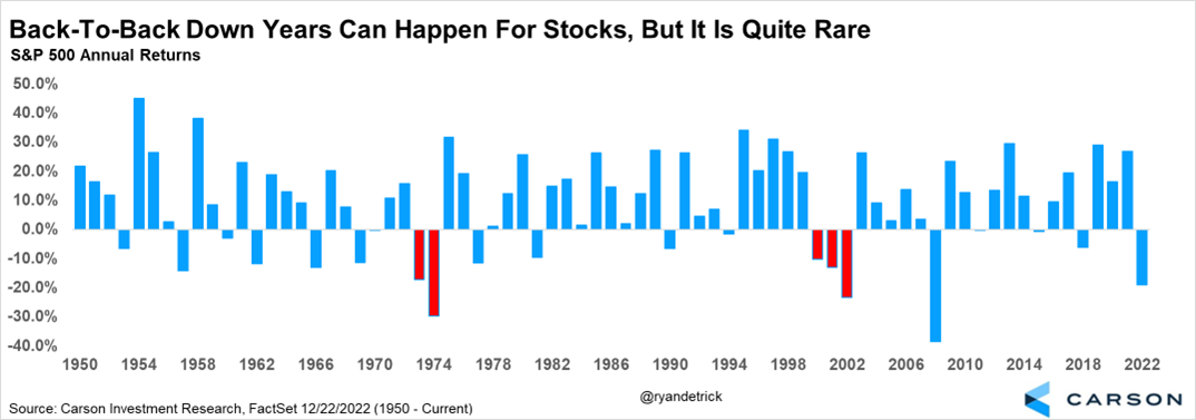 - 2022 was a rough year for the markets, but it is rare for stocks to be down back-to-back years.