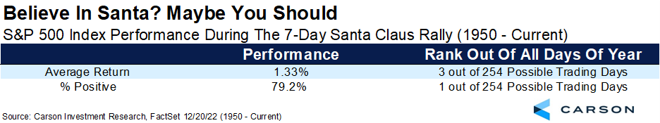 One of the most well-known investment axioms is the Santa Claus rally. Yet, one of the little-known facts about the Santa Claus rally (SCR) is it does not take place during the entire month of December. It actually lasts only seven days. Discovered in 1972 by Yale Hirsch, creator of the Stock Trader’s Almanac (carried on now by his son, Jeff Hirsch), the real SCR takes place during the final five trading days of the year and first two trading days of the following year, not just December. In other words, the official SCR started on Friday, Dec. 23.