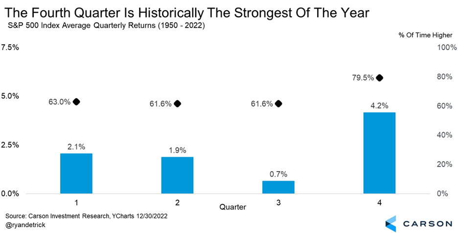 The fourth quarter is typically the best quarter of the year for stocks. The S&P 500 is up nearly 80% of the time and by 4.2% on average, which is twice as strong as the next closest quarter historically, the first, which averages 2.1% growth. One reason the fourth quarter is historically so strong is it’s often rebounding off weakness in the third. This trend has played out so far this year.