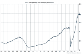In fact, to just keep up, businesses are opening new jobs at the fastest rate ever recorded. The result is 1.94 open jobs for every unemployed person – by far the most ever. Again, that is great for the worker who has more opportunities. But it also means that businesses are competing for employees, which drives wages up and results in inflation.