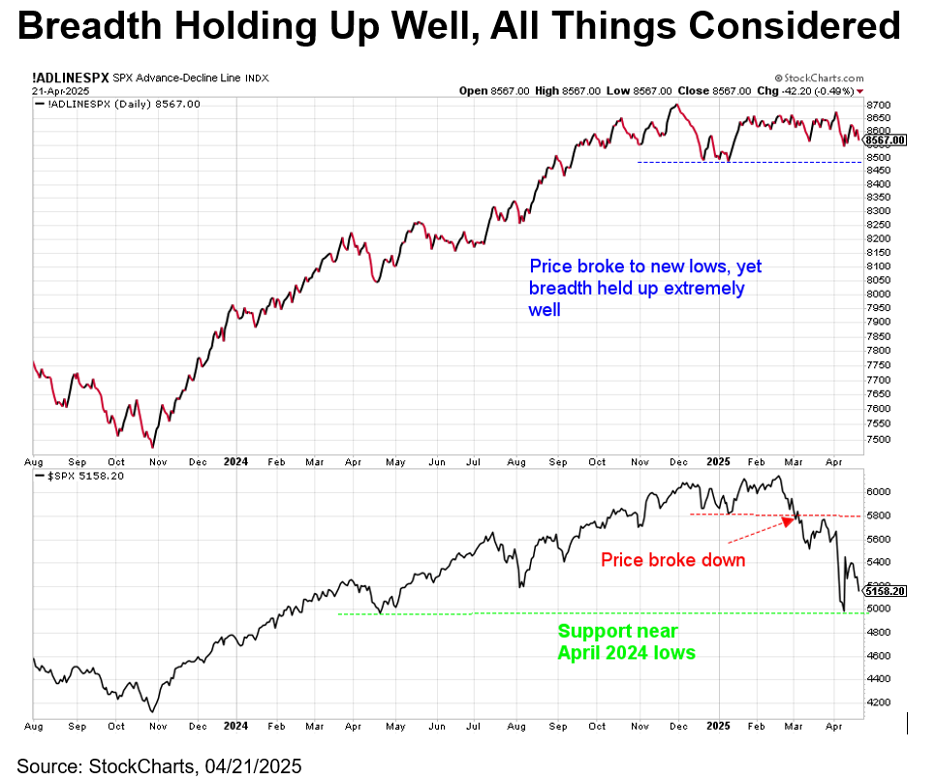 One potential positive is that market breadth has held up quite well in the face of the near-bear market. The S&P 500’s advance/decline line is a cumulative tally of how many stocks advance and decline each day, and it can give clues of how things are really doing under the surface. As the chart below shows, the S&P 500’s advance/decline line has held up well above the early 2025 lows, whereas the S&P 500 price has broken beneath those levels. This suggests there is potential strength under the surface. Additionally, the S&P 500 found support just beneath the 5,000 level, which was also the last low in April 2024.