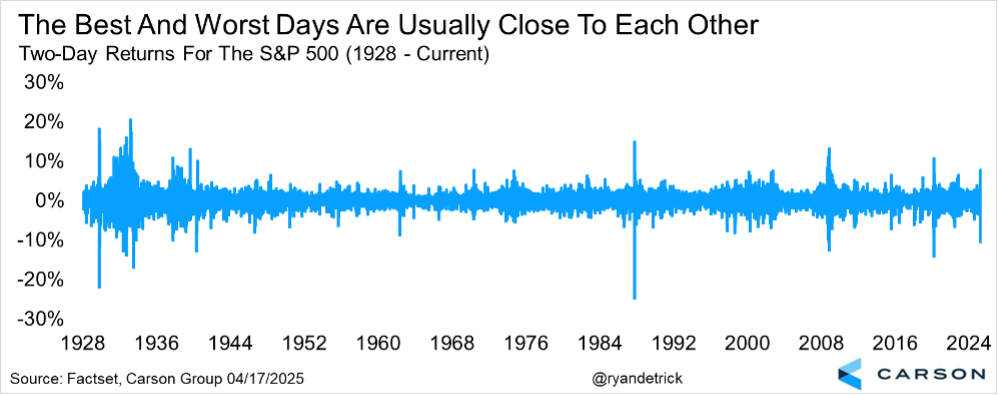 As we’ve noted recently, the best and the worst days tend to happen very close to each other. In fact, on Thursday, April 10 and Friday, April 11, the S&P 500 fell more than 10% for one of the worst two-day returns in history. Many investors couldn’t take it and ,after that historic decline, decided to get out of stocks early the next week. Sure enough, a historic jump was right around the corner, with one of the best two-day rallies ever. As the chart below shows, the big two-day rallies and declines tend to happen near each other—with the worst days usually happening first, often followed by a huge rebound. This is another reminder that volatility is the price we pay to invest, and if you want to experience the big rallies, you will have to hold strong during the declines.